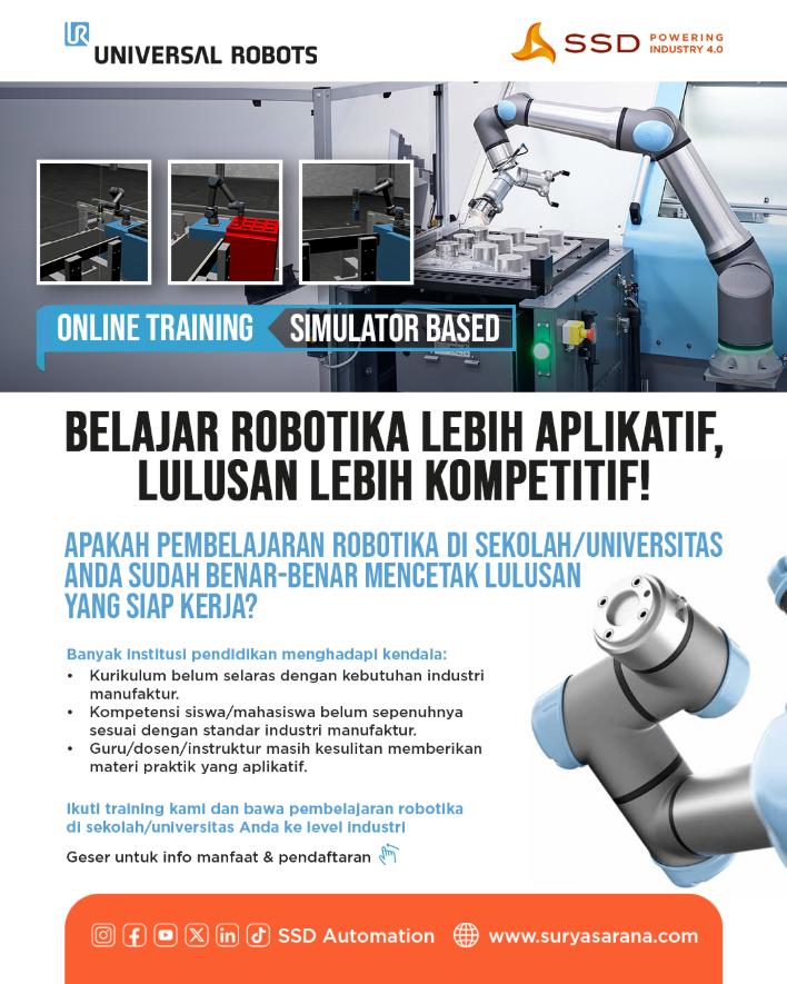 💡 Saatnya tingkatkan kualitas pembelajaran robotika dengan Online Training – Simulator Based dari Universal Robots & SSD Automation!